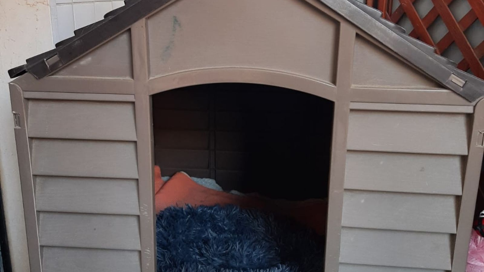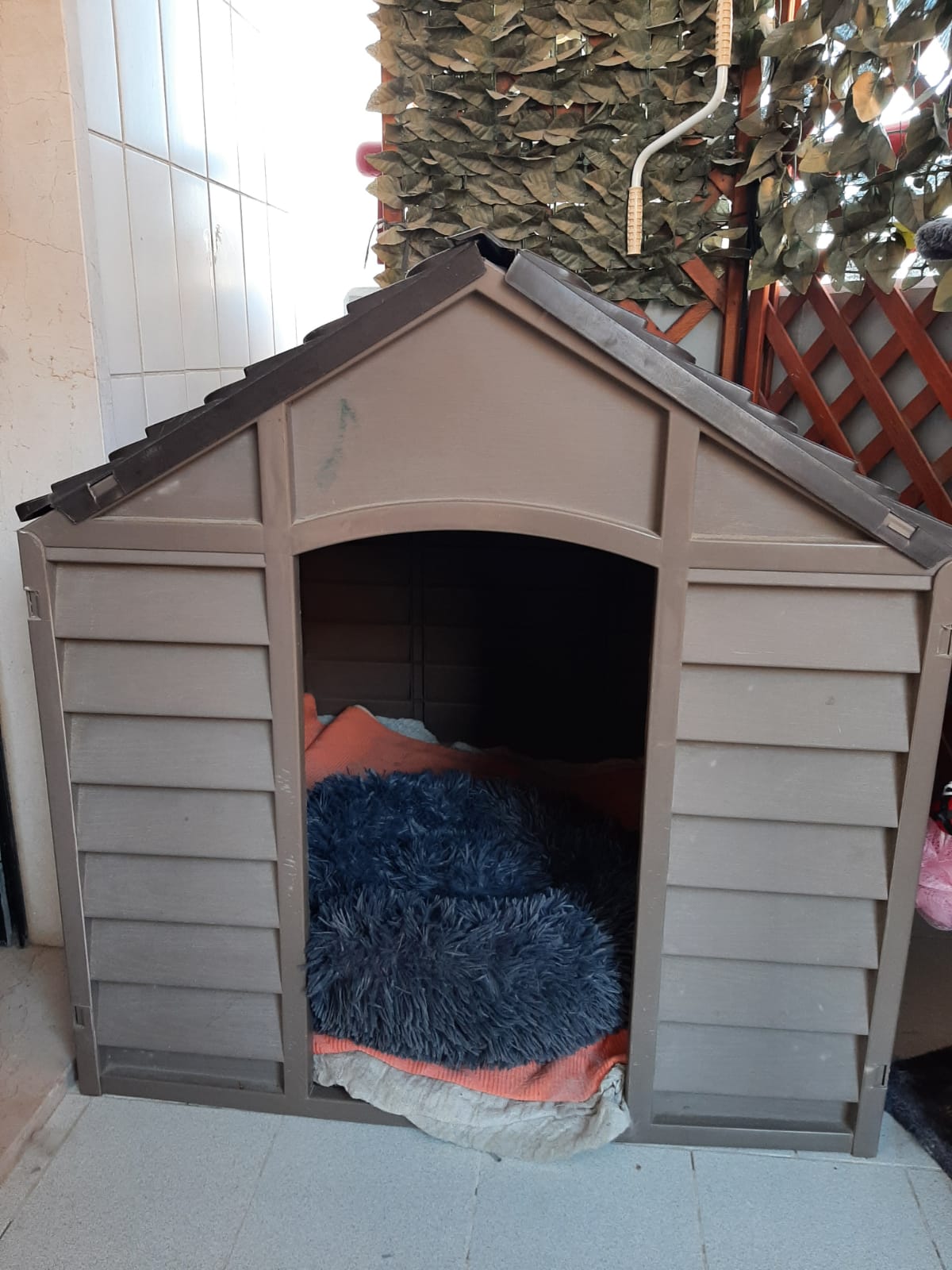in resina maxi plastica, color marrone, taglia media grande 78X84X85 cm. Unica imperfezione riguarda lo spigolo superiore del tettuccio che sarebbe da incollare.